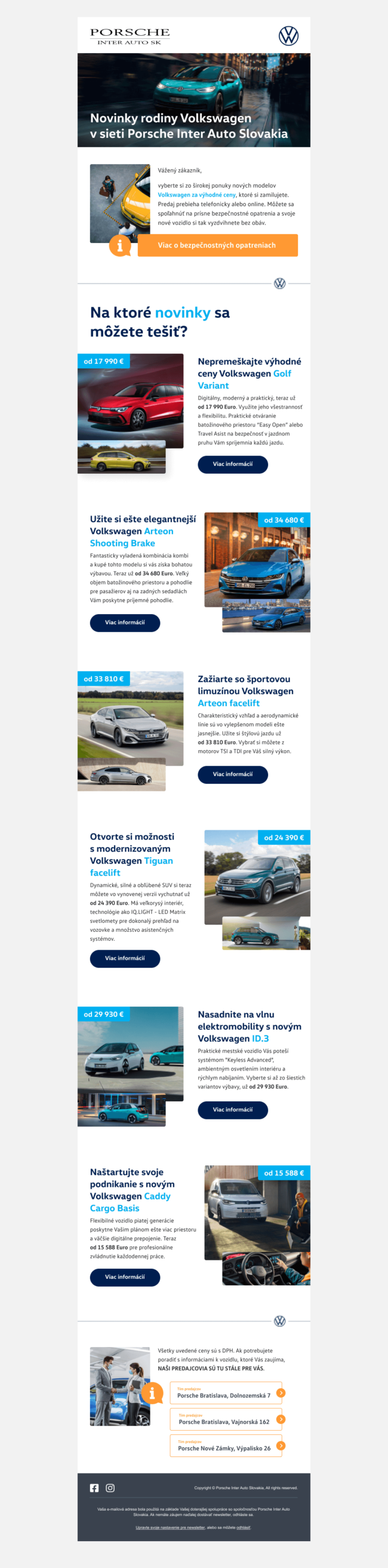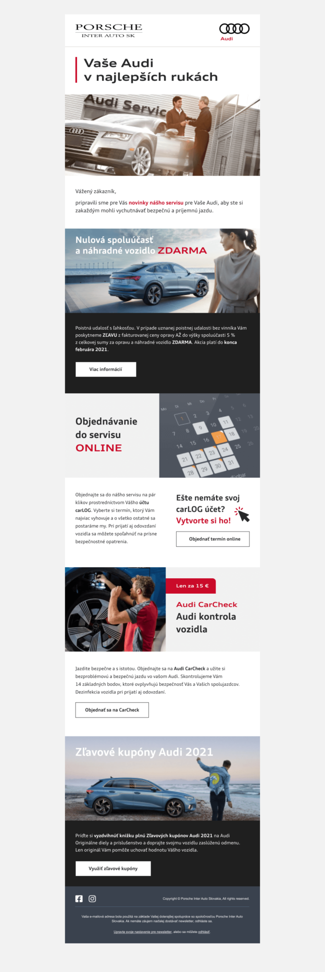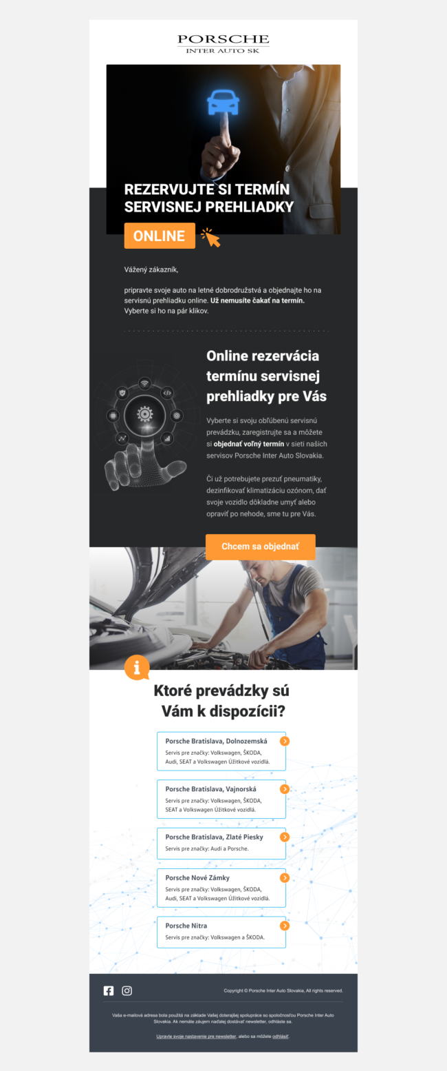 Pre značku Porsche Inter Auto Slovakia, s.r.o. sme vytvorili koncept online obsahovej stratégie, ktorý zastrešil komplexnú komunikáciu na sociálnych sieťach Facebook, Instagram a LinkedIn. Okrem súvislej starostlivosti o social media profily, sme vytvárali fotoobsah v teréne a zároveň tvorili a obsluhovali odosielanie newslettrov.